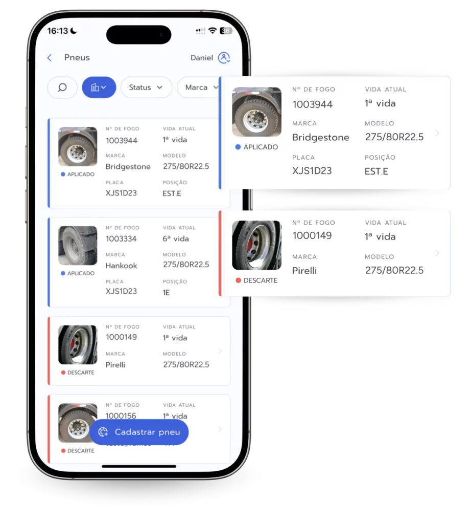 Realize o cadastro e acompanhe o status dos pneus e veículos de sua frota