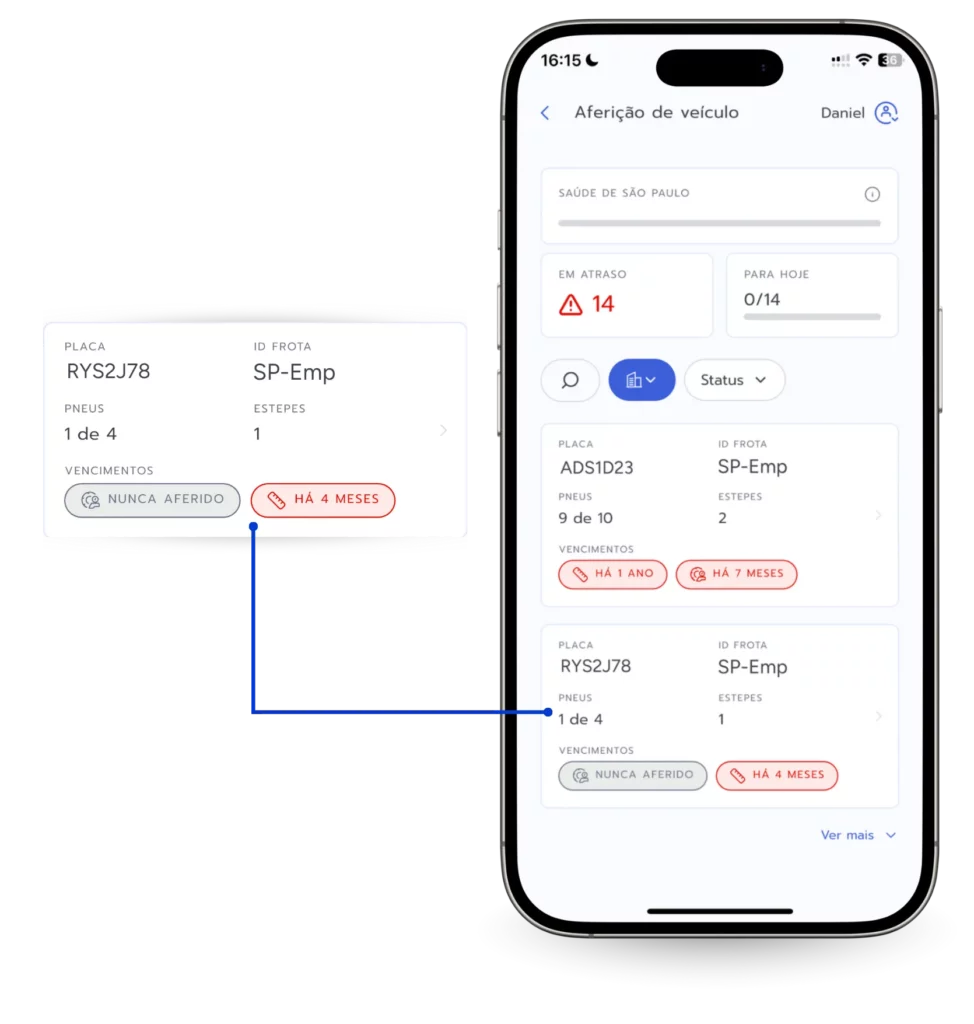 Tenha uma visualização completa e organizada de todos os veículos e seus pneus associados, organizados em grupos e operações.