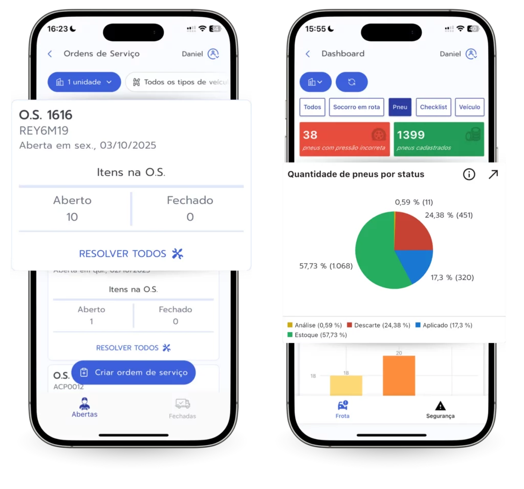 A partir das Ordens de Serviços geradas, realize de forma centralizada todo o controle de manutenção dos pneus de sua frota. Acompanhe os pneus que requerem correção, maiores níveis de desgaste, tempo despendido para manutenção, produtividade de mecânicos e muito mais.